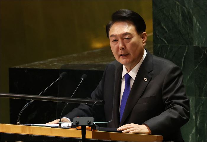 미국을 방문 중인 윤석열 대통령이 20일(현지시간) 뉴욕 유엔본부에서 열린 제78차 유엔총회에서 기조연설을 하고 있다.연합뉴스