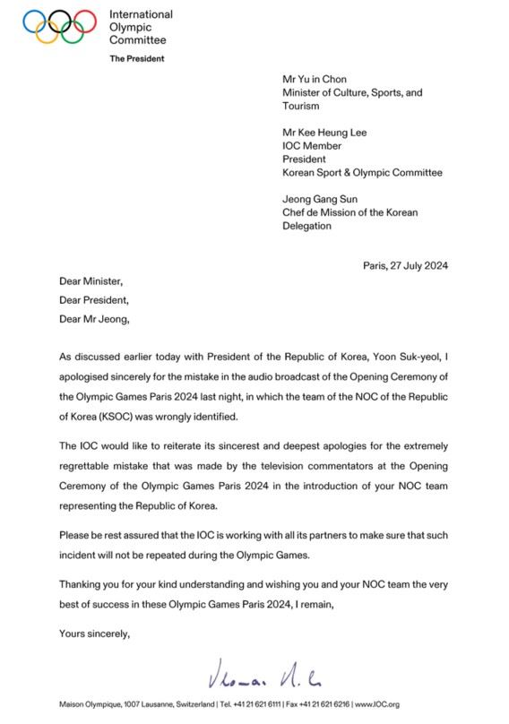 국제올림픽위원회(IOC) 토마스 바흐 위원장은 7월 28일 5시 40분(현지 7월 27일 22시 40분) 경 유인촌 문체부 장관, 이기흥 대한체육회 회장, 정강선 한국 선수단장 앞으로 보내는 서한을 통해 깊은 사과의 의견을 표했다.