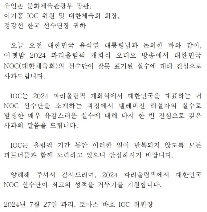이는 ‘2024 파리하계올림픽’ 개회식 중 우리 선수단 입장 순서에서 국가명을 ‘북한’이라고 잘못 표시한 것에 대한 국제올림픽위원회(IOC)의 사과 조치이다.