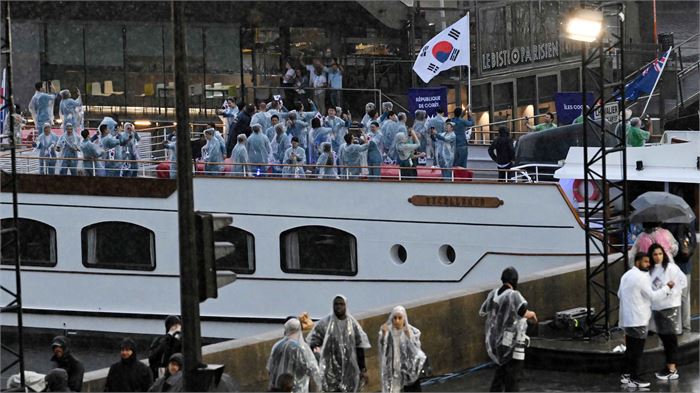 2024 파리올림픽 개회식이 사상 최초로 야외에서 열린 지난 26일 오후(현지시간) 프랑스 파리 센강에서 한국선수단이 탄 배가 지나가고 있다.연합뉴스