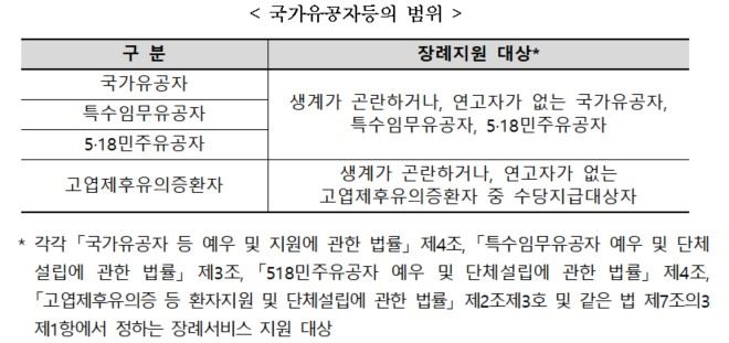 이번 개정안은 무연고 사망자의 장례를 지원하기 전에 국가유공자등 여부를 확인하고, 국가유공자등에 해당하는 경우 사망한 국가유공자의 주소지 관할 지방보훈(지)청에 통보하여 국가보훈부장관이 정하는 장사 예우를 받을 수 있도록 모법이 개정됨에 따라 국가유공자등의 범위를 상세히 정하기 위해 마련되었다.