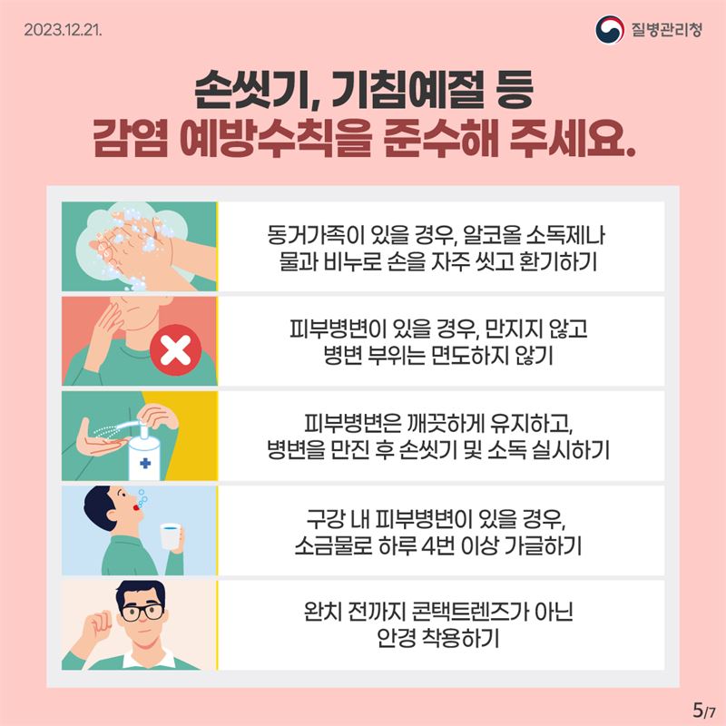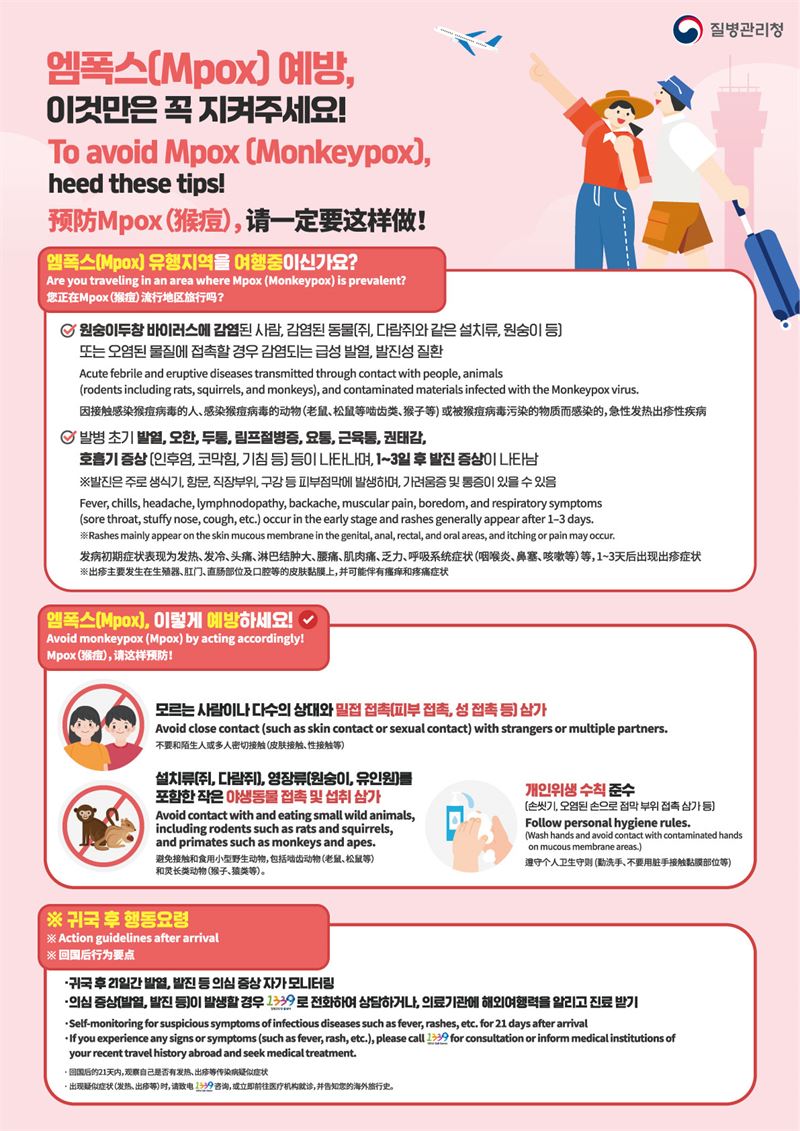 또한 "모르는 사람들과의 안전하지 않은 밀접 접촉(피부·성 접촉) 등 위험 요인과 의심 증상이 있는 경우 의료기관을 통해 조속히 검사받고 고위험군은 감염예방수칙 준수 및 예방접종에 적극 참여해 줄 것"을 당부했다.