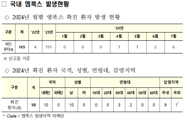 엠폭스는 2023년 국내에서 151명의 확진 환자가 발생했으나, 2024년에는 10명의 확진 환자가 신고되어 유행의 규모가 감소한 상황이다. 확진자의 역학적 특성은 모두 20~40대 남성으로, 주요 증상은 전신 증상과 함께 성기 및 항문 주변의 병변이 보고되었다.
