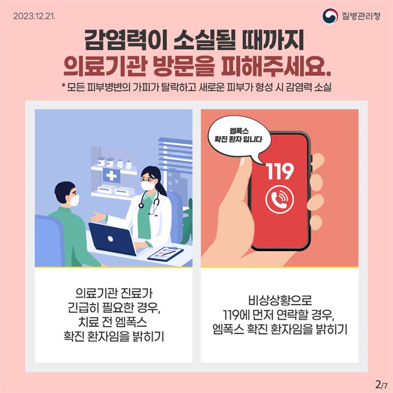 엠폭스는 예방과 치료가 가능한 질병으로, 감염이 우려되거나 의심 증상이 있는 사람은 가까운 의료기관에서 신속하게 진료받도록 하고, 예방을 원하는 고위험군은 예방접종도우미 사이트에서 예약 후 예방접종을 받을 것을 권고했다. (아래 ※알아두기 참조)
