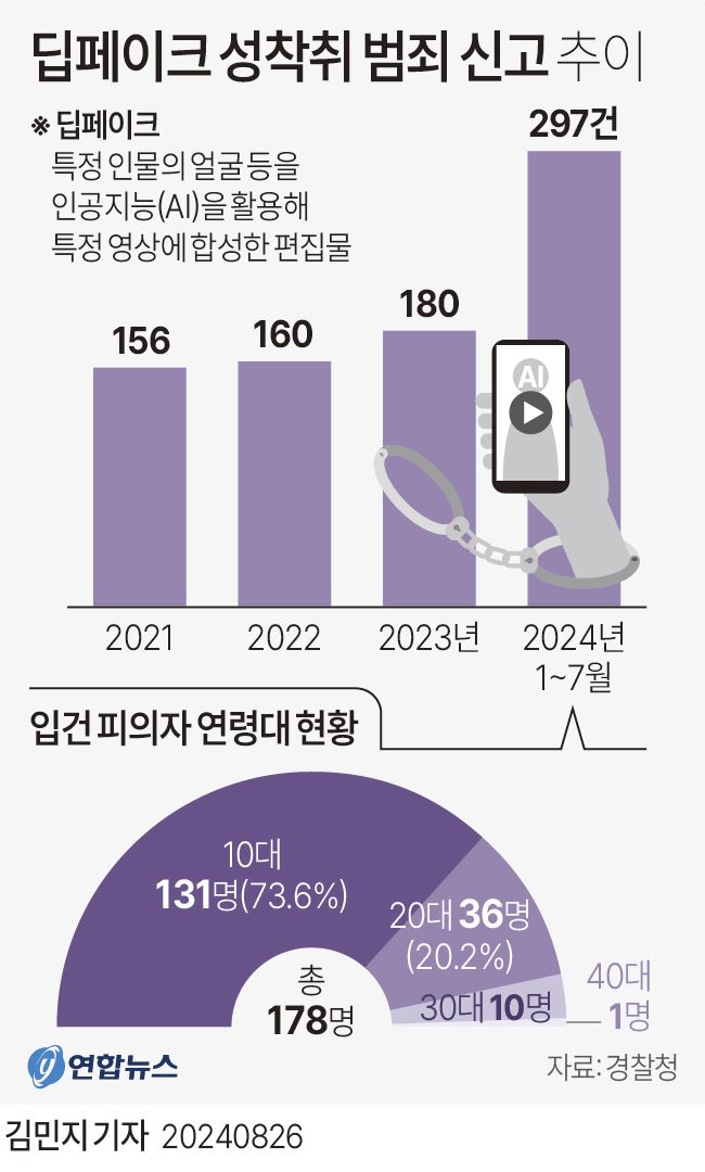 26일 경찰청에 따르면 올해 1∼7월 딥페이크 성착취 범죄(성폭력처벌법상 허위영상물 등의 반포 등) 신고는 전국에서 총 297건 접수됐다.