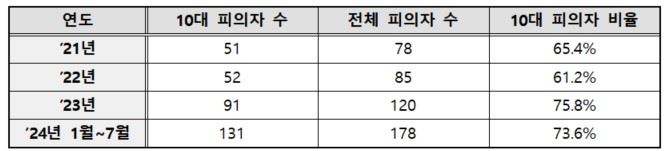 입건된 피의자 178명 중 10대는 131명으로 73.6%를 차지했다.연합뉴스