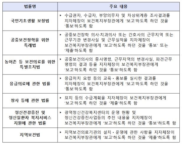 국민기초생활 수급권자 조사결과와 공중보건장학 의사의 근무실적 등 지방자치단체 수행사무에 대한 보건복지부 장관 ‘보고’를 ‘통보’ 또는 ‘제출’로 변경하였다.