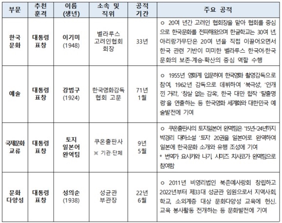 세종문화상: 3인·1단체(대통령표창 4).문화체육관광부