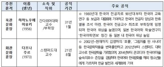 문화포장은 김복순 니카라과 국립자치대학교 언어문화연수원 강사와 리 예카테리나 이르쿠츠크 국립대학교 동양학과장이 받는다.