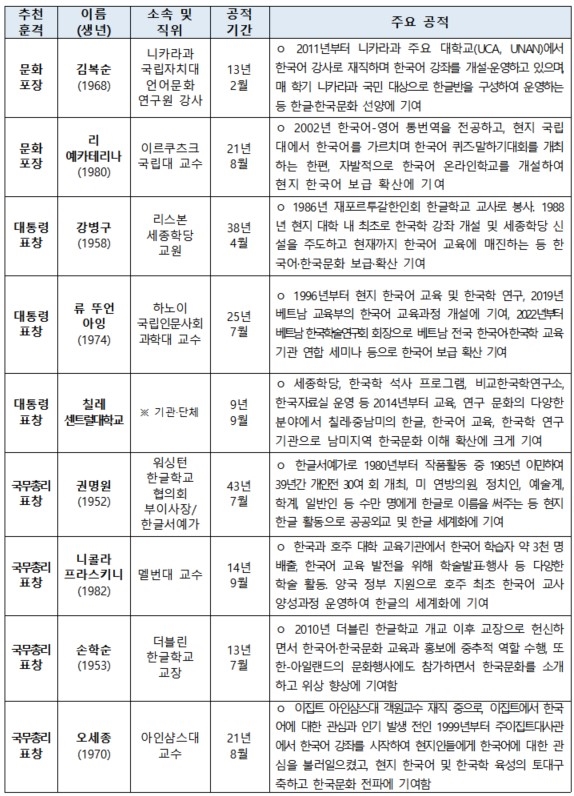 대통령 표창은 강병구 리스본 세종학당 교원, 류 뚜언 아잉 하노이국립대학교 한국학과 학과장, 칠레 센트럴대학교가 수상한다.