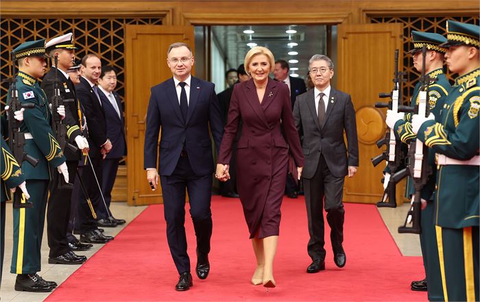 안제이 두다 폴란드 대통령과 아가타 코른하우저 두다 여사가 지난 22일 오후 경기도 성남 서울공항에 도착해 이동하고 있다.연합뉴스