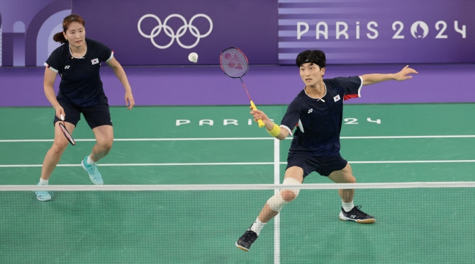 지난 8월2일(현지시간) 프랑스 파리 라 샤펠 아레나에서 열린 2024 파리올림픽 배드민턴 혼합복식 결승전에서 김원호-정나은 조가 중국 정쓰웨이-황야충 조를 상대로 경기를 펼치고 있다.연합뉴스