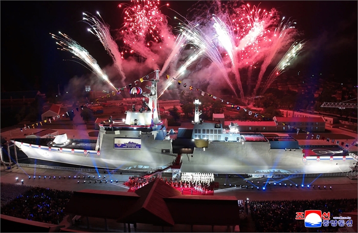 북한이 지난 12일 라진조선소에서 새로 건조한 해군 구축함을 '강건호'로 명명하고 진수기념식을 개최했다고 조선중앙통신이 13일 보도했다.(사진=연합뉴스)