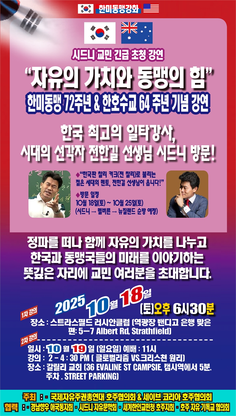 The lecture is supported by Kyoungnam Patriots’ Association, Sydney Freedom Academy, World Korean Church Council, International Freedom Sovereignty Solidarity Australia Association, and the Australian Christian Freedom Network.
