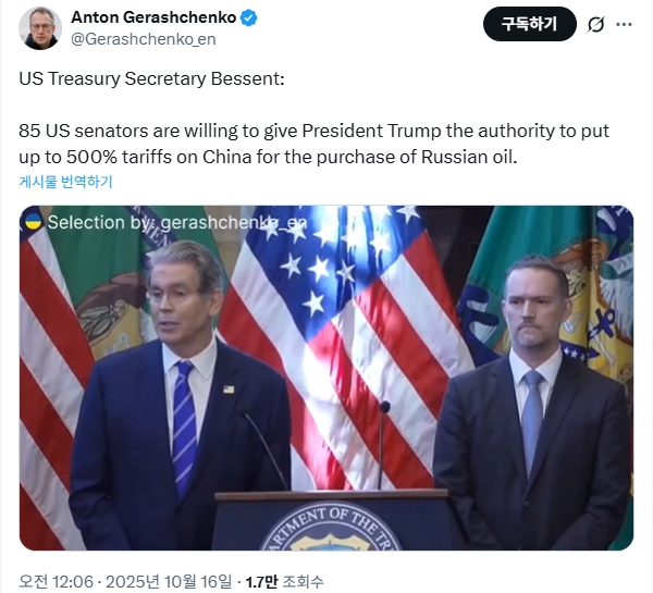 이와 관련, 미 재무부 장관 베센트 역시 미국 상원의원 85명은 기꺼이 트럼프 대통령에게 러시아산 석유 구매에 대해 중국에 최대 500% 관세를 부과할 수 있는 권한을 부여할 의향이 있다고 밝혔다.