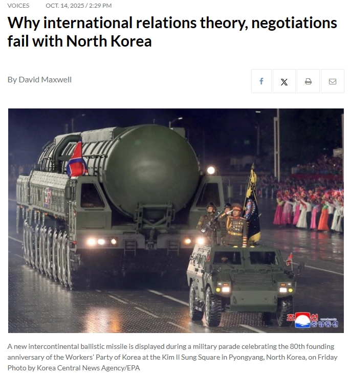 (서울 = 프리덤조선) 미국 특수전 출신 안보전문가 데이비드 맥스웰은 최근 기고에서 “전통적 국제정치 이론과 관행적 협상 방식은 김정은 체제에 통하지 않는다”며, 군사억제와 외교적 압박을 축으로 하고 인권·정보·통일 준비를 앞세우는 ‘투 플러스 쓰리(Two + Three) 전략”을 제안했다.