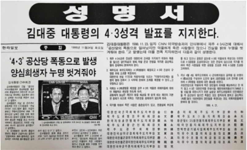 이와 관련, 당시 한라일보에서는 김대중 대통령이 제주 4.3 사건을 정확하게 밝힌 것을 지지하는 성명서가 보도되기도 했다.