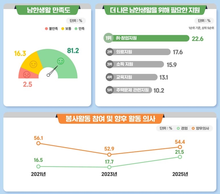 북한이탈주민지원재단(이하 재단)의 '2025년 북한이탈주민 실태조사' 결과, 북한이탈주민들의 남한 생활 만족도가 조사 이래 최고치를 기록했으며, 경제활동 지표도 전반적으로 개선된 것으로 나타났다.