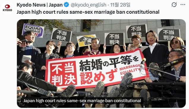 교도통신에 따르면 도쿄고등법원은 지난 28일 동성결혼을 인정하지 않는 현행 민법 조항이 합헌이라고 판결했다.이는 전국 6건의 동성결혼 소송에서 유일하게 국가 입장을 인정한 고등법원 판결이다. ◆ “부부란 남녀” 해석은 여전히 합리적 재판장 히가시 아유미 판사는 “현행 결혼제도는 자녀 양육 환경을 정비하는 데 유용하며,