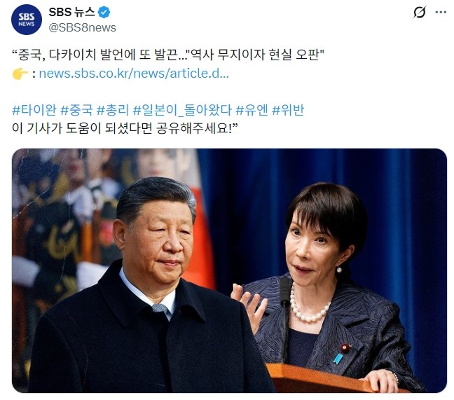 중국, 다카이치 사나에 일본 총리 '대만 지위 미정' 발언에 강한 비난