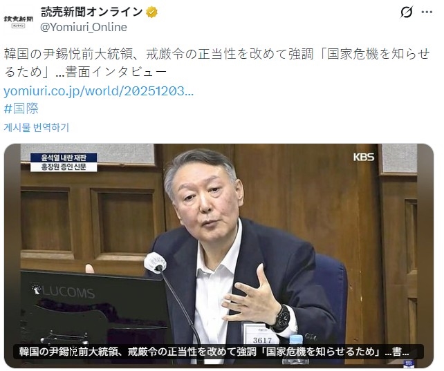 3일 일본 요미우리신문에 따르면, 윤석열 전 대통령은 지난해 12월 3일 비상계엄 선포 1주년을 맞아 서면 인터뷰에서 이를 “자유민주주의 헌정 질서의 붕괴와 국가 위기 상황에서 내린 국가 비상사태 선언”으로 규정하며 “주권자인 국민에게 이런 상황을 알리기 위한 것”이었다고 재차 정당성을 강조했다.윤 전 대통령은 현재 진