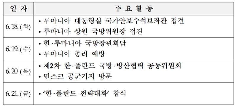 신원식 국방부장관은 6월 17일부터 22일까지 루마니아와 폴란드를 방문해 한‧루마니아 국방장관회담 및 제2차 한‧폴란드 국방‧방산협력 공동위원회를 개최할 계획이다.