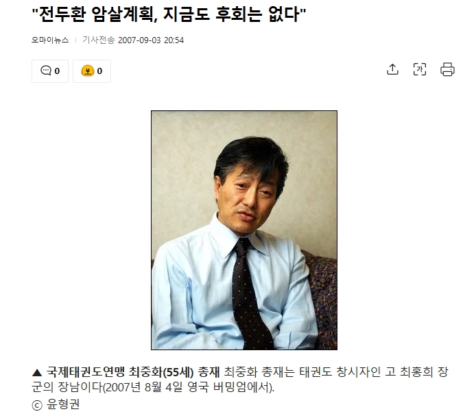 2007년 오마이뉴스에 보도된 북한 국제태권도연맹 최중화 총재. 최 총재는 오마이뉴스에서 "광주에서 수천 명을 전두환이 학살했다는 것을 알고 죽이려 했으며, 유태계 마피아에게 돈을 받아 실행하려 했으나, 캐나다 당국이 사전 포착해 실패했다."고 주장했다. / 2007년 오마이뉴스 화면 캡처