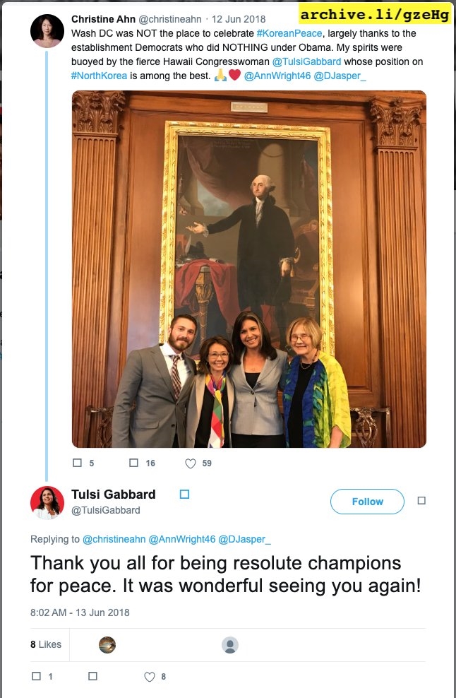 툴시 개버드 미국 국가정보국장은 2018년 UN 북한대표부 박철이 배후라는 지적이 나온 위민크로스 DMZ 크리스틴 안(툴시 개버드 오른쪽), 평화주의를 명분으로 내걸지만 실제로는 미국 내에서 극좌 페미니스트 반이스라엘 입장을 되풀이하는 CODE PINK 앤라이트(사진 맨 왼쪽)와 친분이 깊으며, 이들을 "평화를 위한 확고한 챔피언, 다시 만나서 반가웠다!"라고 할 정도로 재미 종북 세력과 가깝다. 툴시의 과거 발언이나 다른 미국 내 맑시스트 조직, 공산당 조직, 친러시아 조직, 친 시리아 및 친 베네수엘라 공산당들과의 오랜 인연을 고려하면, 이들과 확고하게 뜻을 함께 함을 확인할 수 있다.