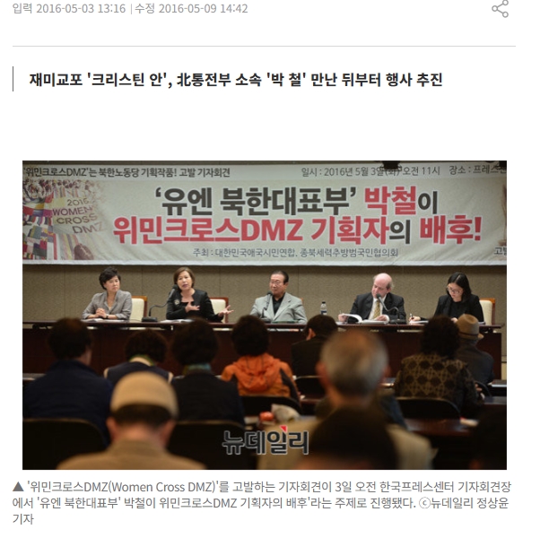 2016년 평화 단체임을 내세우는 미국내 한인 조직 위민크로스 DMZ를 기획한 세력의 배후는 UN 북한대표부 박철임을 폭로하는 탈북 여성 박사 이애란, 이동복 전 의원, 로렌스 펙 변호사. / 뉴데일리 화면 캡처