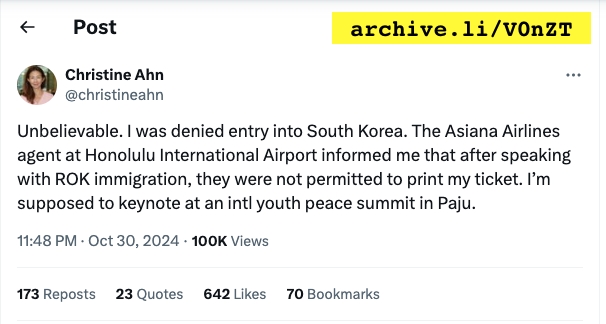 2024년 10월 30일 크리스틴 안이 직접 올린 소셜 글. 안씨는 "믿을 수 없다. 나는 대한민국 입국이 거부되었다."라며, 호놀룰루 국제 공항 아시아나 항공을 타려다가 거부당했음을 올린 바 있다. 안씨는 작년에도 북한과 가까운 파주에서 '국제 청년 평화 정상회담'에서 핵심 역할을 하기로 되어 있었다며 한국 입국이 금지된 것에 대해 좌절감을 드러냈다. 이 행사 명칭이 'summit'으로 끝나는 것은 올해 7월 27일에서 29일 뉴욕에서 대표적 재미 종북 단체 <노둣돌>이 중동 테러 조직 가담자임이 밝혀져 예일대 법학교수직에서 해고된 인물 등 전세계 반미, 반이스라엘, 반트럼프 행사 명칭과 유사해 특히 눈길을 끈다.