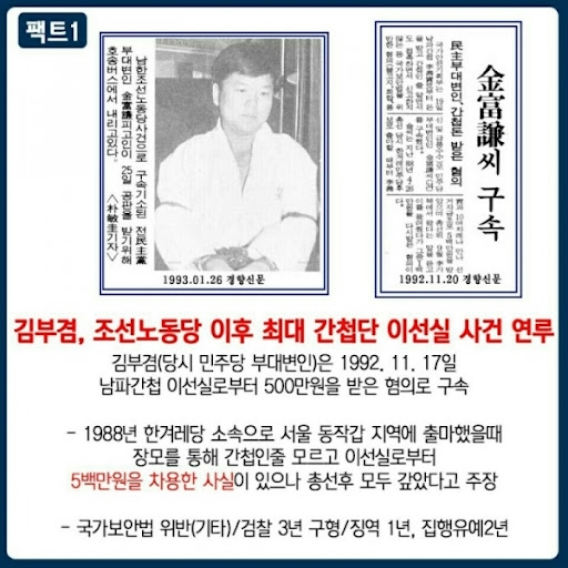역대 가장 종북적인 정권이란 평가를 받는 지난 문재인 정부에서 총리를 역임한 김부겸은 이미 청년 시절인 1988년부 북한 노동당 서열 22위 거물 간첩 이선실로부터 거액의 공작금을 받은 혐의로 구속된 바 있다. 당시 500만원은 한국에서 수도권 외곽 주택도 구입할 수 있는 거금이다.