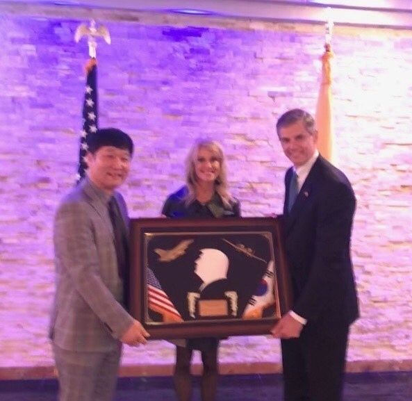 사진 왼쪽은 주성배 뉴저지 트럼프 후원회장, 가운데는 백악관 콘웨이 고문. / 사진 제공 = 방주혁 조각가