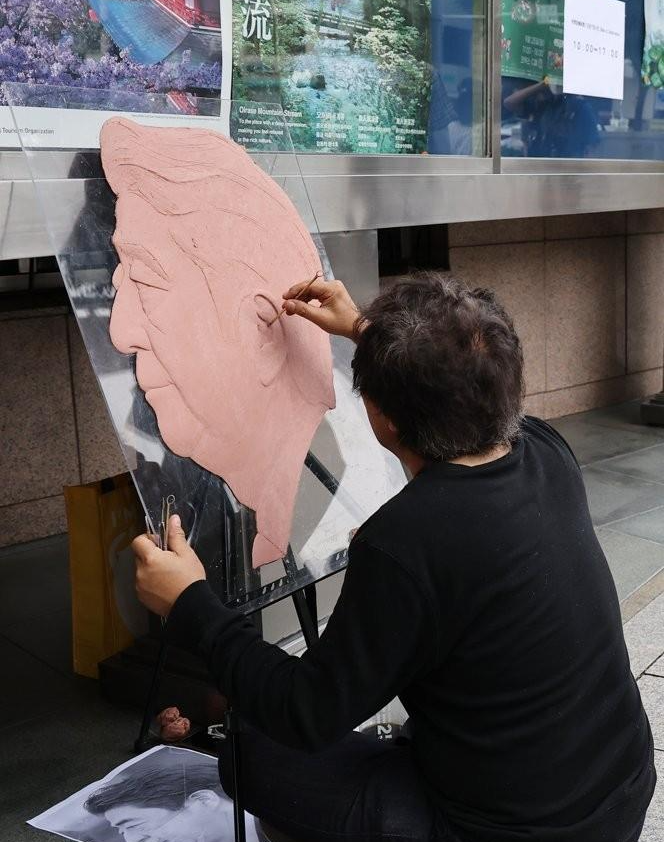 아베 전 총리의 안타까운 죽음을 애도하며 조각을 통해 추모하고, 한일관계의 발전을 기원 중인 방주혁 조각가 / 사진 = 연합뉴스