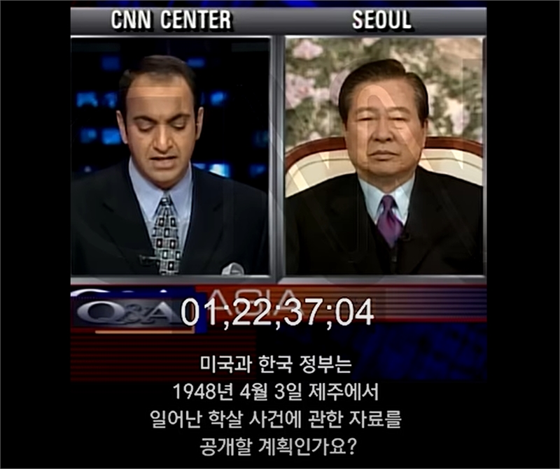 영화 <건국전쟁>의 김덕영 감독이 발굴한 영상 자료에 따르면, 지난 1998년 11월 23일 CNN과의 인터뷰에서 김 전 대통령은 “한국과 미국 정부는 1948년 제주 4·3사태에 대한 진상은 서로 언제 공개할 방침인가?”라는 질문을 받은 바 있다.