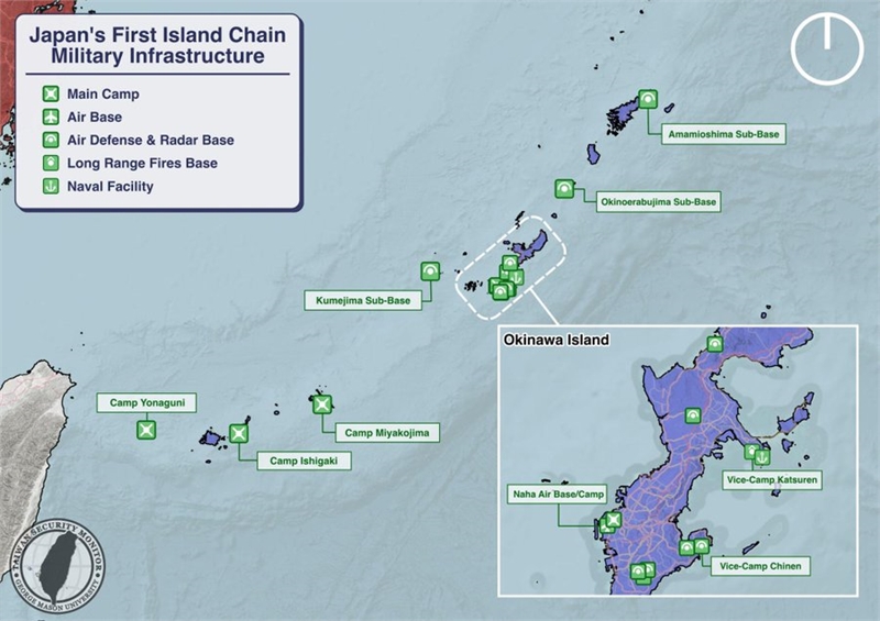 일본의 대만 유사시 개입 가능성과 서태평양에서의 중국군 활동 증가로 인해 일본과 중국 간 긴장이 고조되는 가운데, 중국 해군(PLAN) 랴오닝 항모전단이 미야코 해협을 통과해 북상했으며 현재 일본 인근 해역에서 작전을 전개하고 있다. 사진은 오키나와를 포함한 제1도련선 내 일본 자위대(JSDF) 시설을 TSM이 시각화한 자료다.(글.사진=엑스(X, 구 트위터) 게시물 캡처